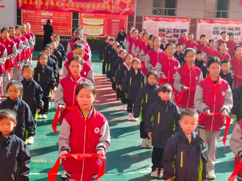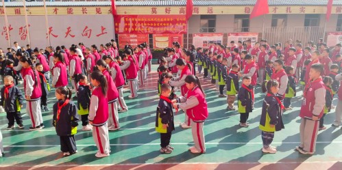 优秀老队员为新生队员庄重地佩戴上亮丽的红领巾,传统与新生在这一刻交融汇聚。