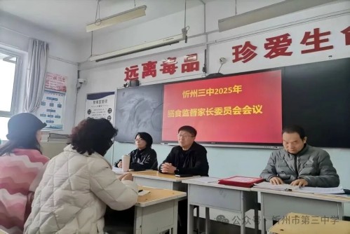 2025年10月23日,忻州市第三中学校在教学楼一楼组织召开膳食监督家长委员会会议。校长王建保、副校长李玲、学校后勤负责人、食堂管理员及11名家长代表参会,旨在加强家校沟通,共同提升食堂膳食质量与安全管理水平。