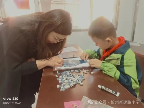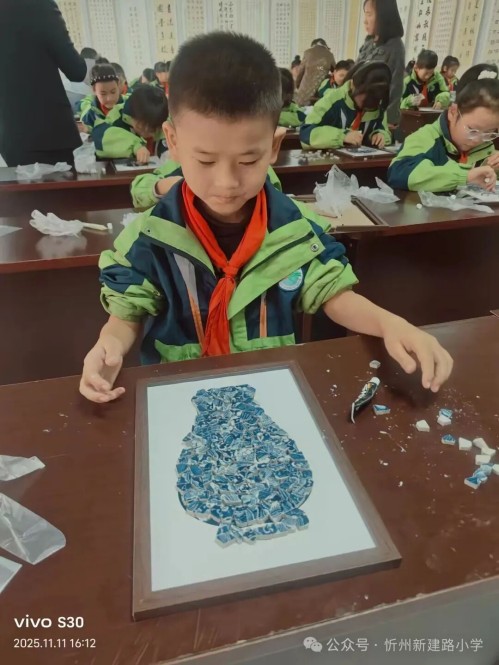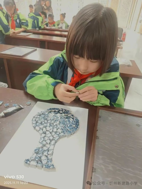 碎瓷片拼贴活动中,孩子们发挥想象力,将彩色瓷片组合成各种图案。这项活动不仅锻炼动手能力,还让孩子们学会在破碎中寻找美好,理解传统文化的包容与创新。