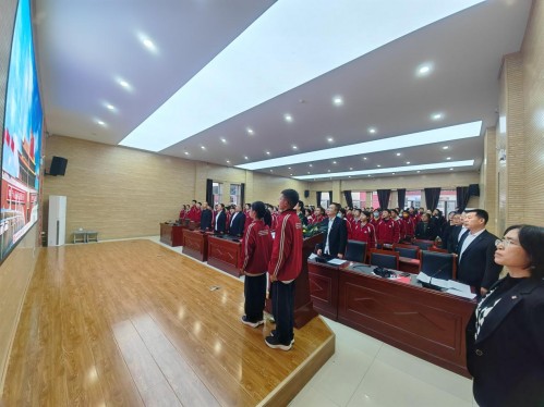 大会在雄壮的中华人民共和国国歌声中拉开帷幕。随后进行议程第二项“回顾征程,细数成长”。主持人带领全体师生深情回顾了开学以来初一新生入学教育的各项举措与成效:衔接适应扎实推进,行为规范有效落实,综合素质显著提升。大家共同重温了同学们在课堂上的专注、自习时的投入、操场上的奔跑,那一幕幕勤学苦练、挥洒汗水的生动画面。回顾中感受到了同学们在探索中进步、在合作中成长、在挫折中奋起的点滴收获。这些成绩的取得,离不开老师们无私的奉献、家长们默默的守护,也离不开同学们自身不懈的努力。三方合力,共同铺就了成长的阶梯,也成为青春路上最美的印记。