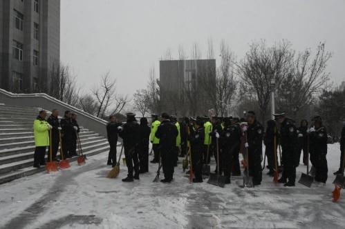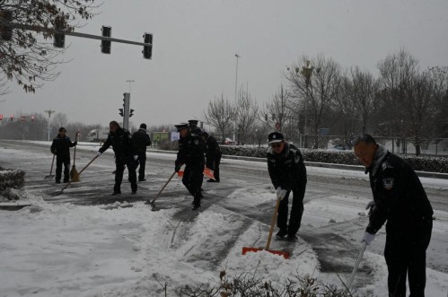 凛冽寒风里,皑皑白雪中,民辅警们分工协作、干劲十足,有的挥动铁锹铲除路面积冰,有的手持扫帚清扫路面积雪,有的在路口引导车辆、行人安全通行,形成了一道道靓丽的“藏蓝风景线”。