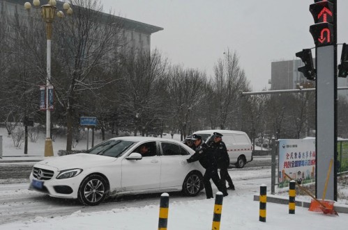 执勤民辅警还主动帮助受困车辆脱困,护送老人、儿童安全过马路,一幕幕暖心场景在风雪中上演。经过数小时的连续奋战,为群众开辟了一条条安全畅通的“暖心路”。