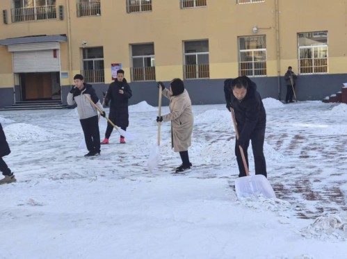 有的教师双手紧握铁锹,奋力铲除坚硬的冰层;有的教师默契配合,用扫帚将积雪归拢成堆;口中的呼号与工具的碰撞声交织成冬日校园里最动人的旋律。