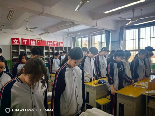 升国旗班级是高三26班。主持人王炳宇,升旗手赵致冰,葛俊男同学作了题为《铭记国家公祭日,厚植爱国情怀》的国旗下讲话。在雄壮的国歌声中,全场师生面向冉冉升起的五星红旗行注目礼,以此缅怀所有惨遭侵略者杀戮的死难同胞,以及为抗日战争胜利献出生命的革命先烈与民族英雄。