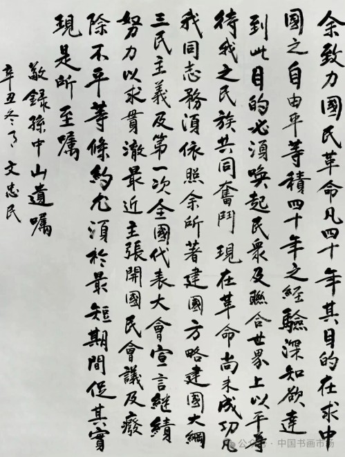 辛亥革命,是近代中国追求民族独立、国家富强的伟大起点。此篇聚焦孙中山先生的遗嘱、辛亥革命元老的志业以及黄埔军校校歌等经典文本。于右任本人便是辛亥革命的亲历者与推动者,以其书体书写这段历史,具有天然的历史契合感。文忠民将军的笔墨,再现了“革命尚未成功,同志仍须努力”的谆谆告诫,传递着“怒潮澎湃,党旗飞舞”的豪迈气概。这揭示了祖国统一大业与辛亥革命“振兴中华”的初心一脉相承,统一是革命事业的最终完成。书法艺术在这里成为历史的回响,提醒两岸同胞,我们拥有共同的光荣起点,也必将迈向共同的光明未来。