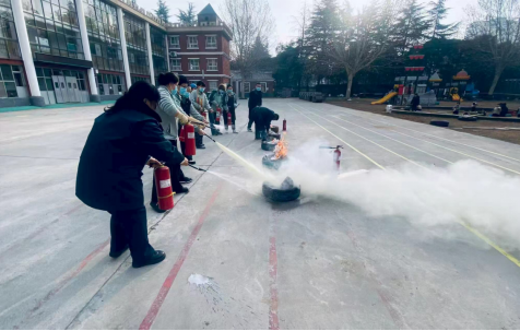 理论学习结束后,全体教职工移步校内前楼空地开展消防实操演练。演练现场以轮胎模拟火灾场景,真实还原火灾突发情境,教职工们依次上阵,亲手拿起灭火器以“提、拔、握、压”标准步骤进行实操,对准模拟火源进行灭火操作,从生疏到熟练,切实掌握了灭火器的正确使用方法与初起火灾扑救技巧。通过沉浸式、实战化的演练,全体教职工进一步将理论知识转化为实操能力,应急反应、协同配合与现场处置能力得到有效提升。
