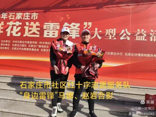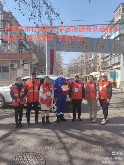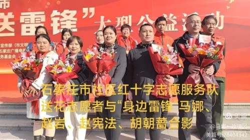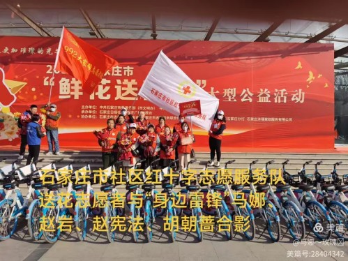 石家庄市社区红十字志愿服务队十年来组织开展学雷锋活动100多场,帮扶困难群众一千多人,马娜、赵岩、赵宪法、马海平、张士周等十多位优秀志愿者在3月5日毛泽东同志“向雷锋同志学习”题词周年,由中国文明网主办,石家庄市等10个城市联办的“鲜花送雷锋,真心献祖国---我是新时代雷锋传人