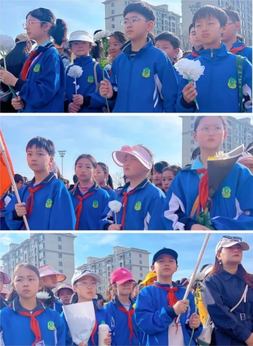 4月2日清晨,五年级全体师生身着统一服装,整齐列队于操场。同学们佩戴鲜艳红领巾,手持自制小白花,神情庄重肃穆;班主任分列队伍首尾;家长义工全程护航。在工作人员的有序组织下,全体人员精神饱满,迈着坚定的步伐前往渡淮纪念馆,一路红旗飘扬,秩序井然。