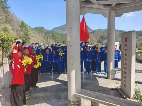 接官亭镇中心小学在麻柳铺村委会广场开展“清明祭英烈”主题活动。活动伊始,全体辅导员和少先队员们共同清扫红军亭,以洁净的环境表达对革命先烈的缅怀与敬意。随后,队员们依次敬献鲜花,寄托深切哀思,传承红色基因。
