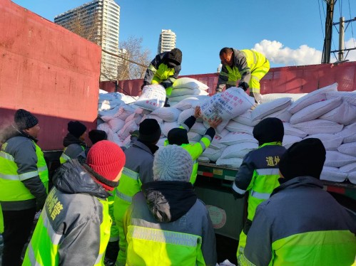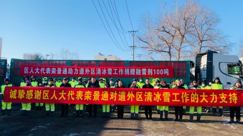 而且始终坚守初心、情系道外。2024年,他曾向道外区捐赠100吨融雪剂,为辖区冬季除雪工作提供有力支持;时隔两年,今天他再次慷慨解囊,累计捐赠融雪剂达150吨。此次捐赠的50吨融雪剂,将有效补充道外区冬季清雪物资储备,助力环卫部门高效开展除雪作业,保障市民出行安全与城市道路畅通。